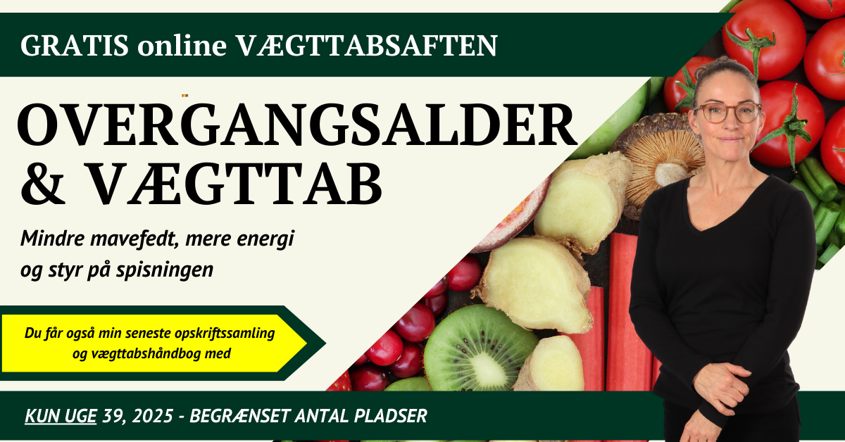 I forbindelse med udgivelsen af min nye bog Sunde vaner i overgangsalderen (Gyldendal 2026) inviterer jeg til gratis online vægttabsarrangement på udvalgte dage i uge 52 og 1. Arrangementet varer 60 minutter og inkluderer hjælpeark samt mit suveræne snacksheet.
